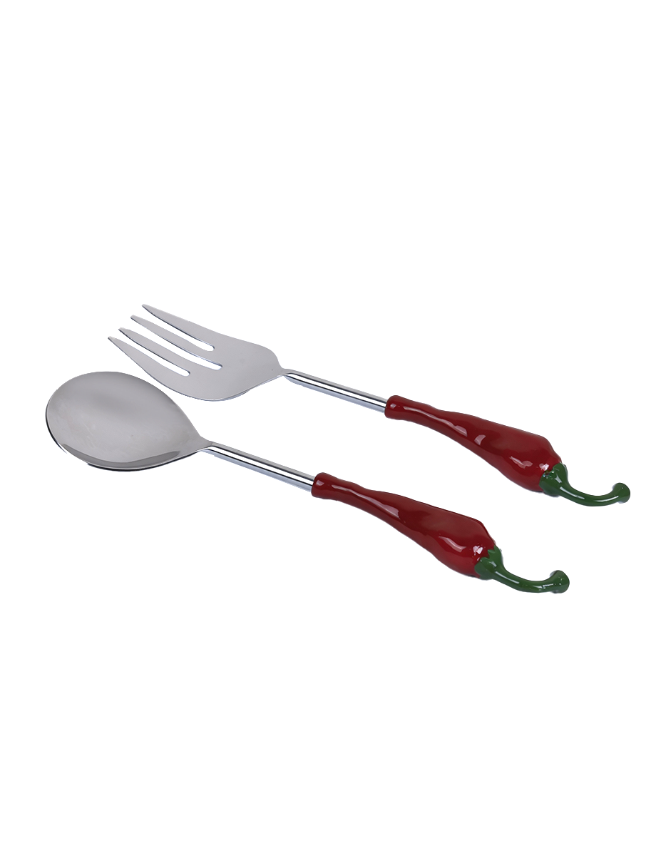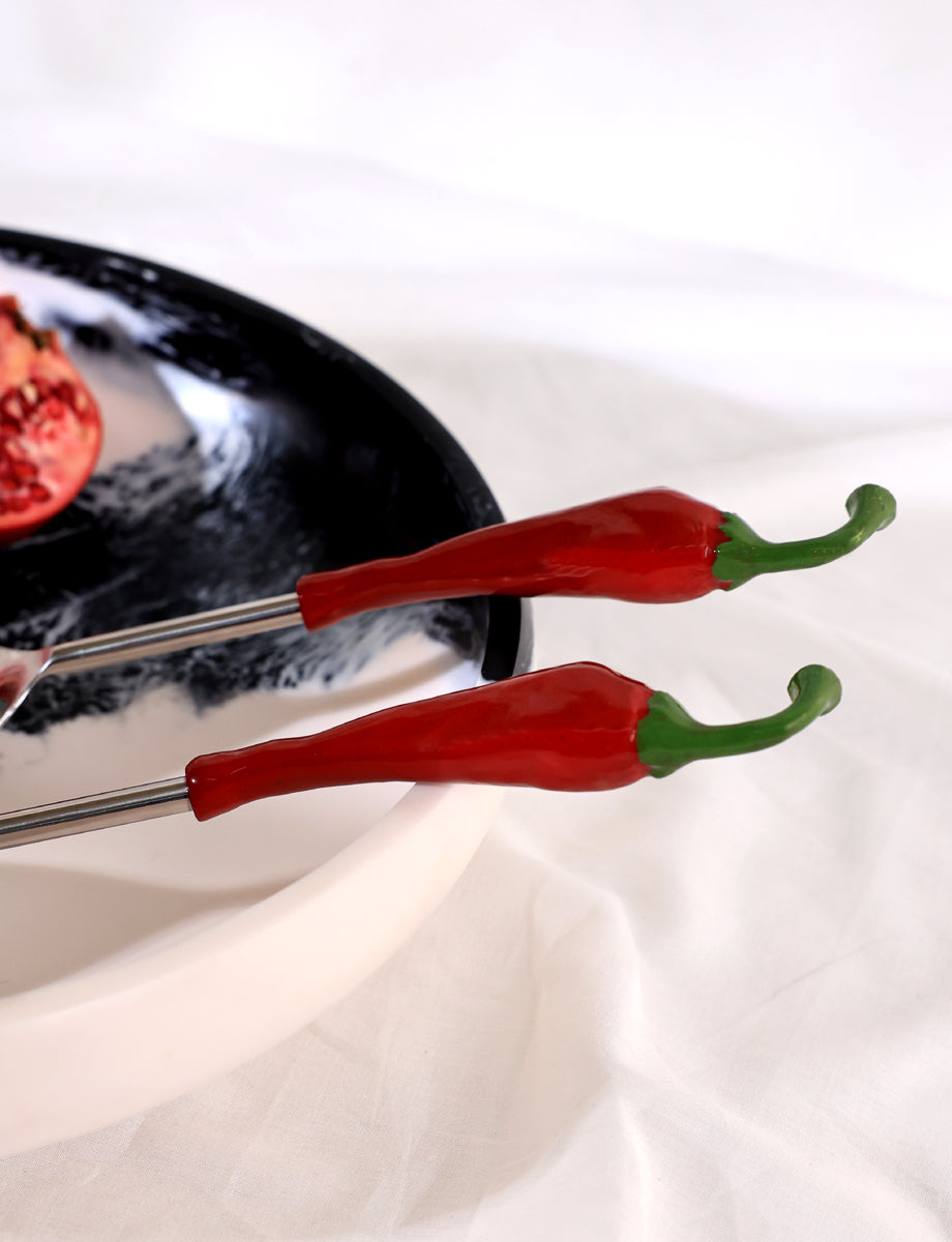 Handcrafted in metal, this distinctive salad serving set brings a playful twist to everyday dining. Featuring sleek metal servers finished with sculptural chili-shaped handles, each piece blends bold design with artisanal craftsmanship. Both functional and eye-catching, the set adds a hint of spice and modern character to your table, making it perfect for serving salads.